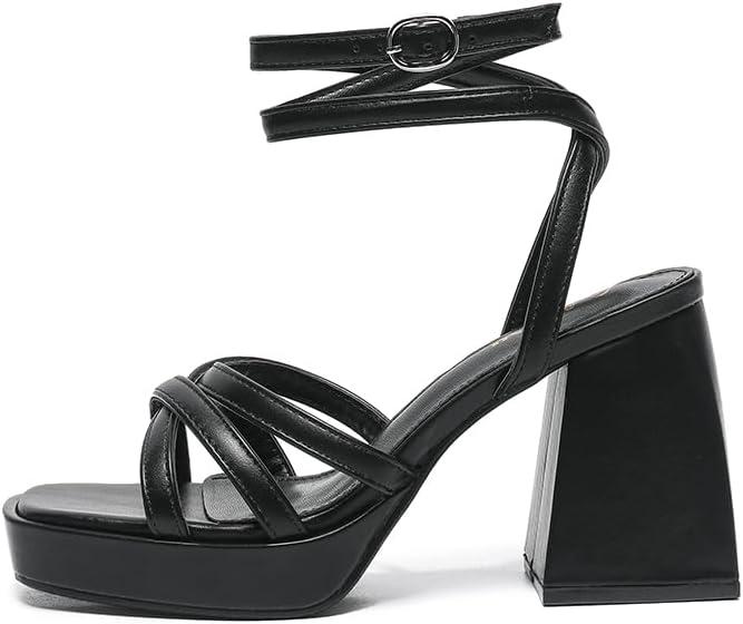 Amoji Women’s 4 Inch Platform Chunky Heel Strappy Ankle Strap Block Heeled Sandals 305(Black)
